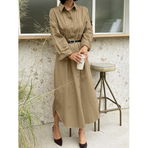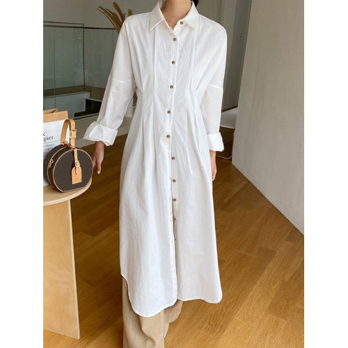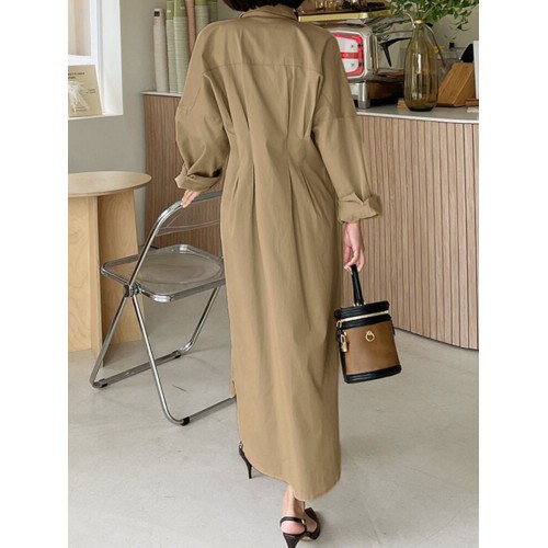 Women Shirt Collared Spliced Buttons Pleated Solid Casual Midi Dresses