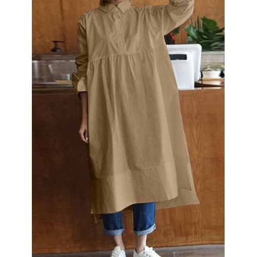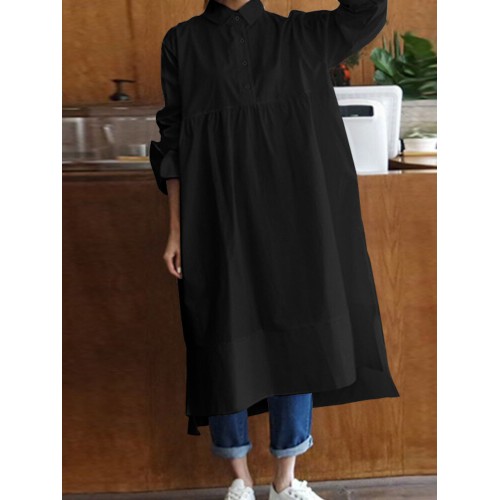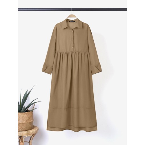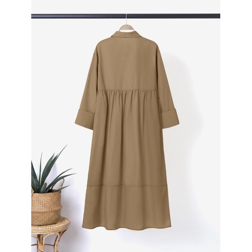 Women Shirt Long Sleeve Collared Calf Length Front Buttons Midi Dresses