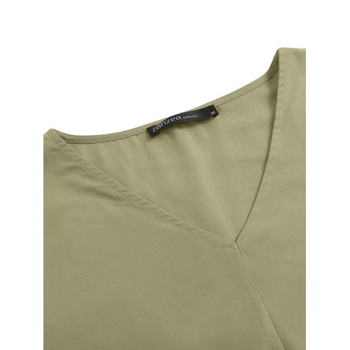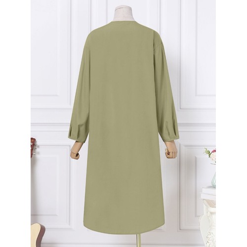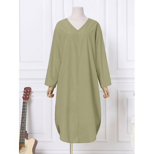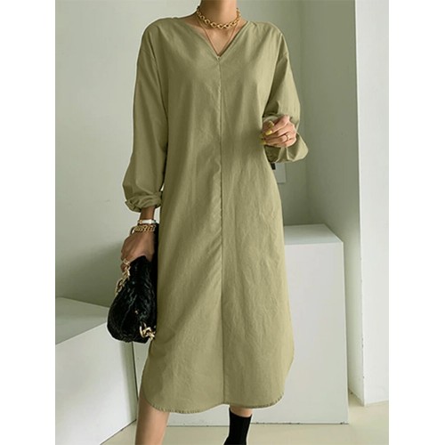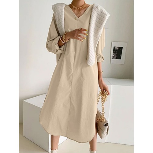 Women Side Pockets Side Fork V Neck Solid Calf Length Midi Dresses