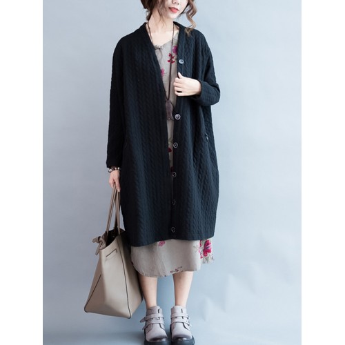 Plus Size Solid Color Knit Pocket Long Sleeve Calf Length Cardigans