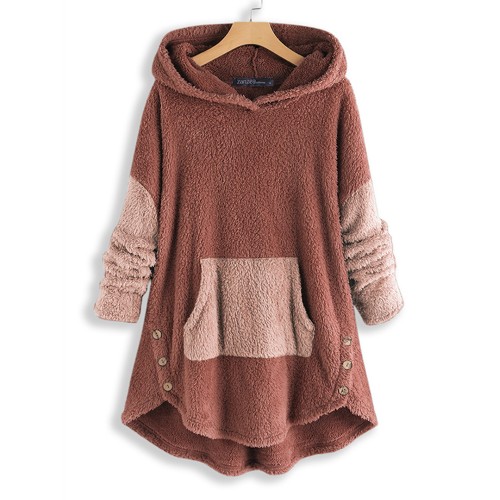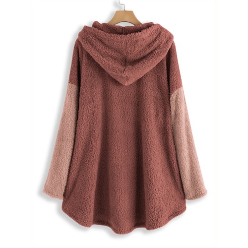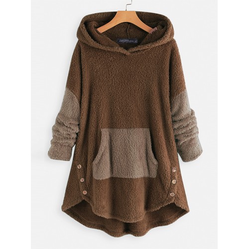 Women Contrast Color Splice Irregular Hem Hooded Fleece Sweatshirt Coats