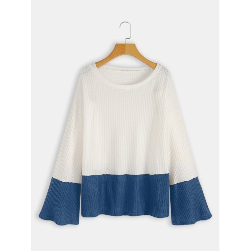 Plus Size Contrast Color One Shoulder Bell Sleeve Knit Sweaters