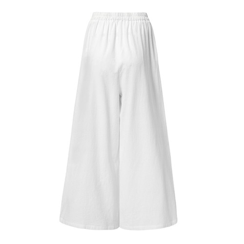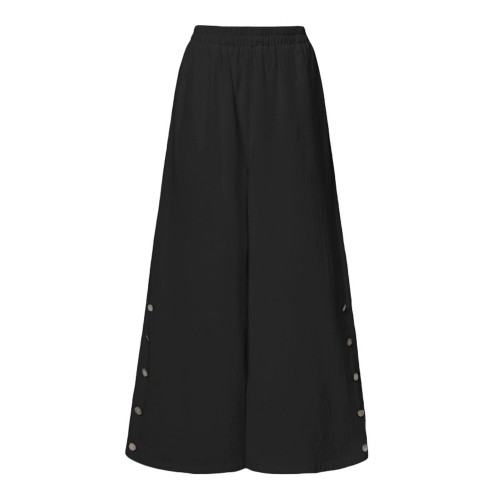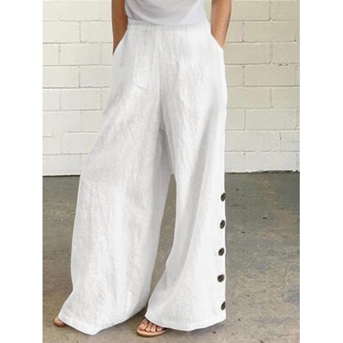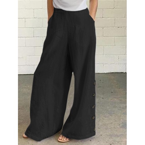 Women Cotton Solid Color Button Side Pocket Elastic Waist Wide Leg Pants