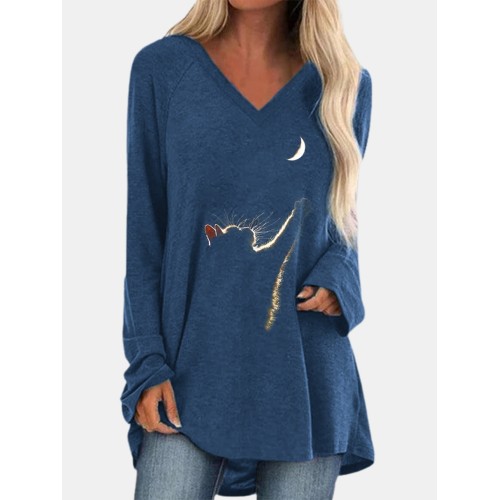 Cat Print Long Sleeves V neck High Low Hem Casual T shirt For Women